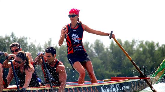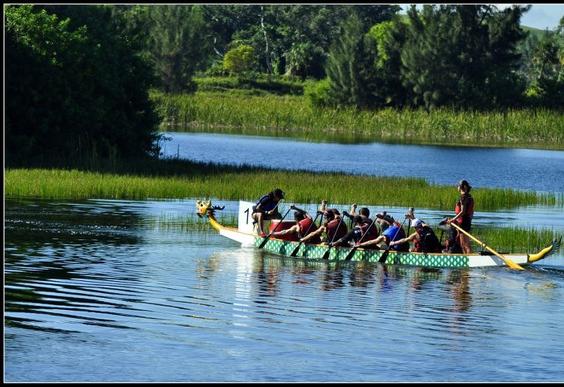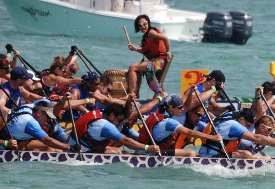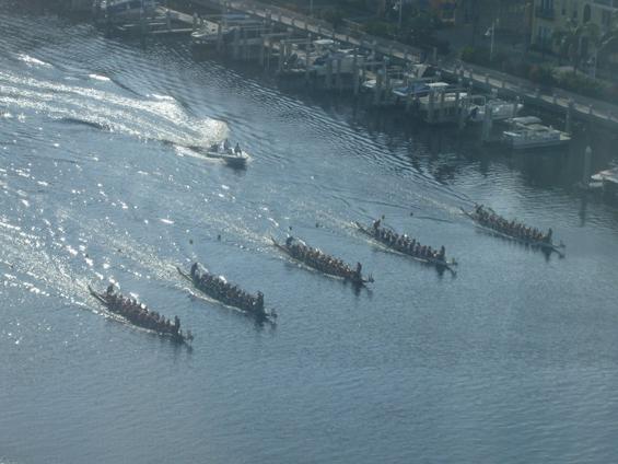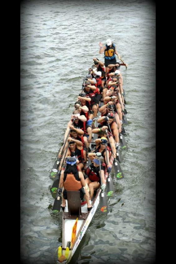The incredible power of 20 in perfect synch, Puff Dragon Boat Racing Team, Miami, Florida. What is the steersman doing back there?
